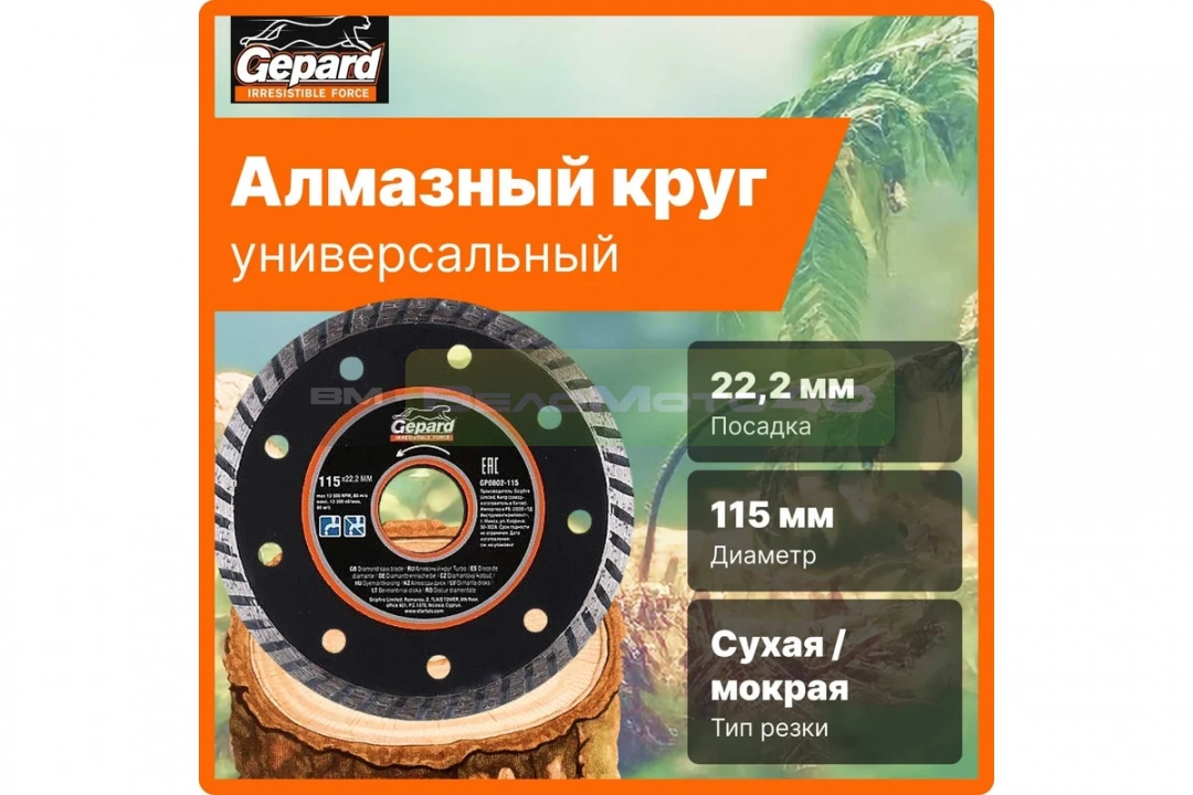 Круг алмазный Turbo 115x22 мм Gepard GP0802-115 применяется для сухой и мокрой резки гранита, кирпича, бетона, строительного камня, тротуарной плитки и других твердых материалов.