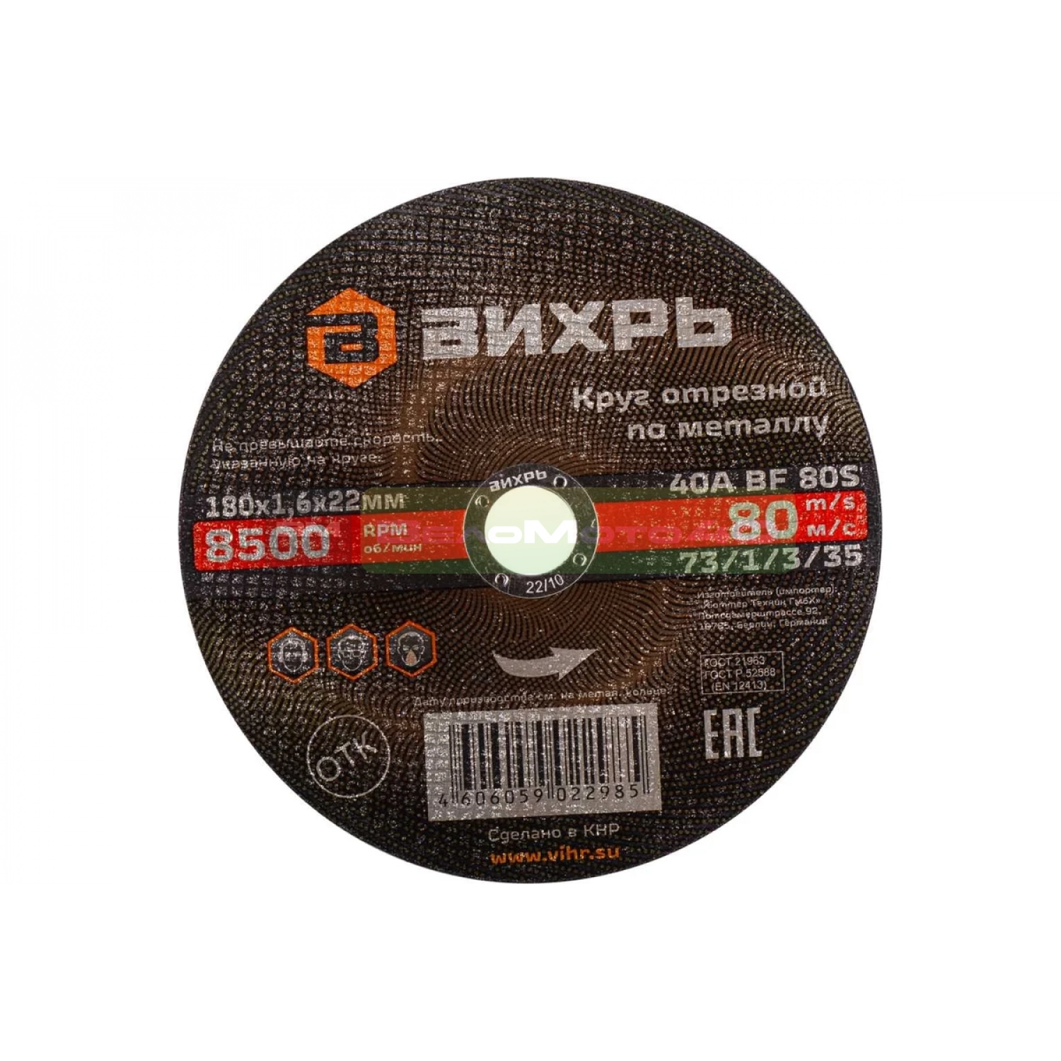 Круг отрезной по металлу (180х22х1.6 мм) Вихрь 73/1/3/35
