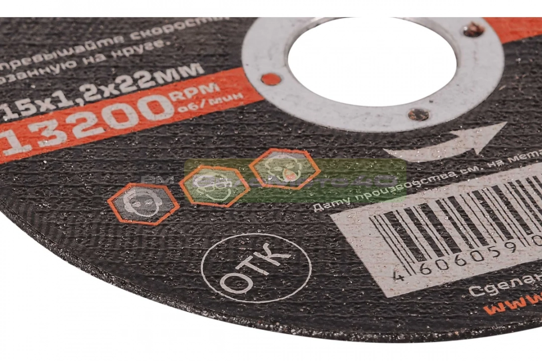 Круг состоит из абразивного полотна, армированного для прочности специальной сеткой (бакелитовая связка), которая придает отрезному диску прочность и препятствует разлету осколков при заклинивании диска или его повреждении.