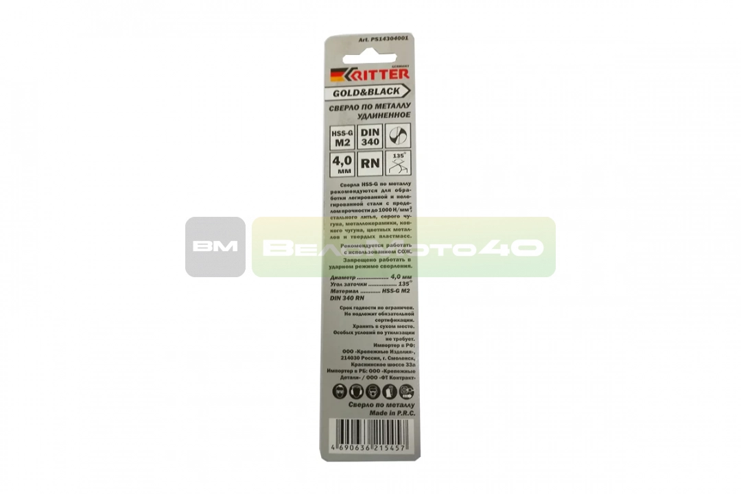 Сверло удлиненное по металлу EC Gold&Black 4 мм, HSS-G M2, DIN 340, RN RITTER PS14304001 выполнено из высококачественной быстрорежущей инструментальной стали (улучшенный аналог Р6М5). С подточкой поперечной кромки, угол заточки 135 градусов.