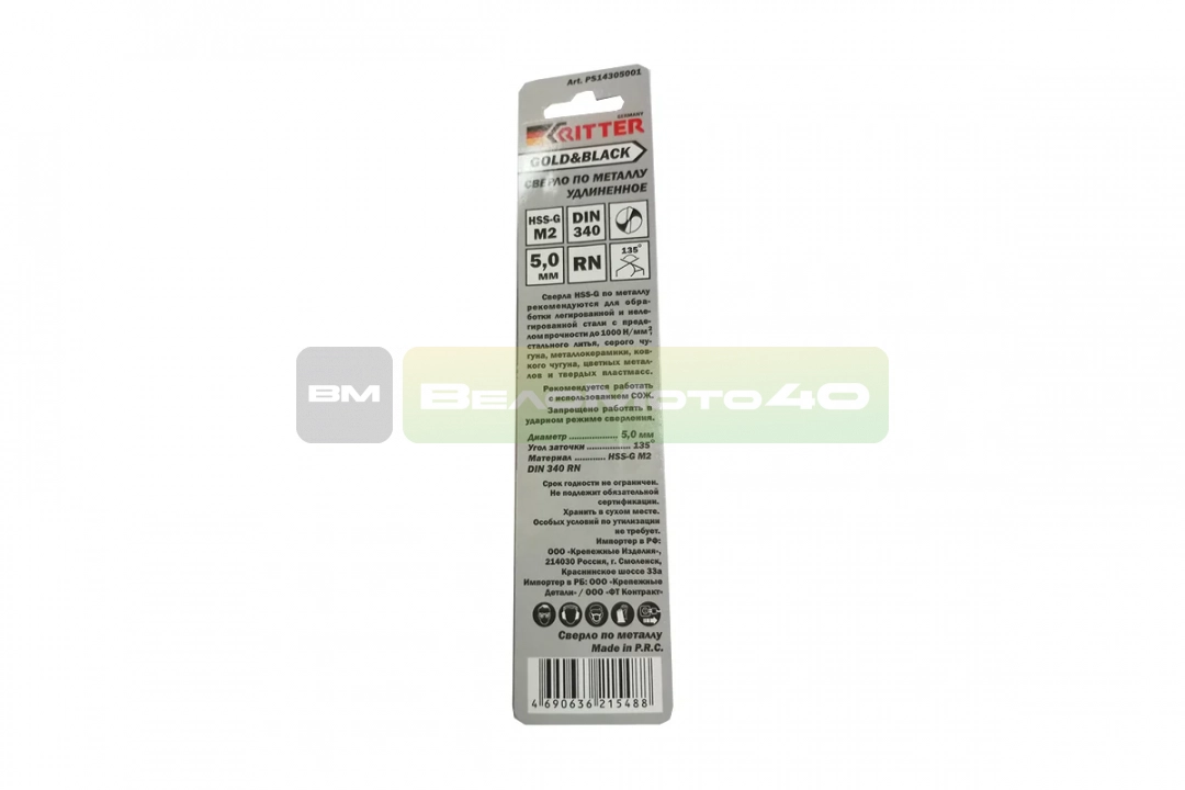 Сверло удлиненное по металлу EC Gold&Black 5 мм, HSS-G M2, DIN 340, RN RITTER PS14305001 выполнено из высококачественной быстрорежущей инструментальной стали (улучшенный аналог Р6М5). С подточкой поперечной кромки, угол заточки 135 градусов.