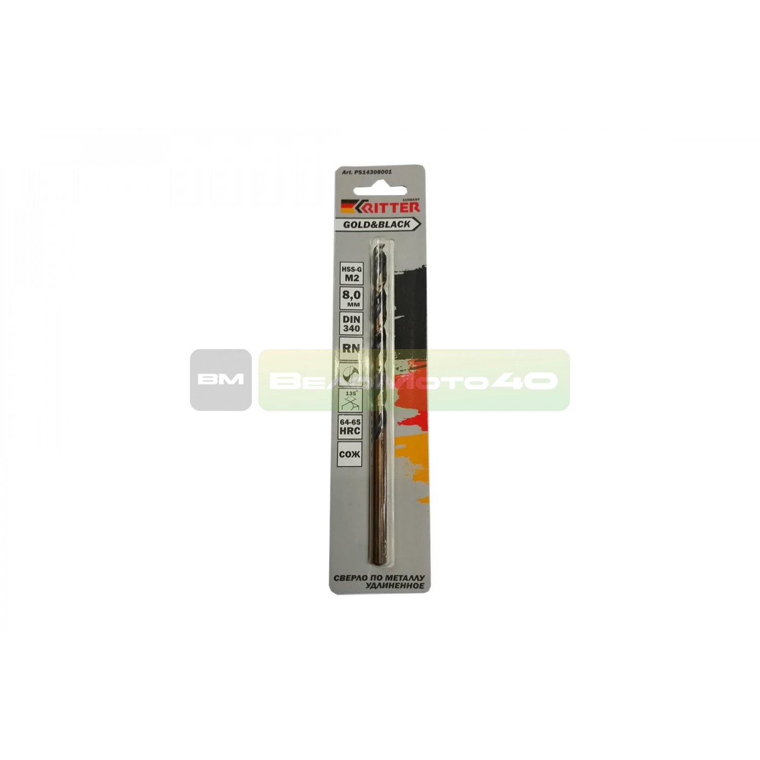 Сверло удлиненное по металлу EC Gold&Black 8 мм, HSS-G M2, DIN 340, RN RITTER PS14308001 выполнено из высококачественной быстрорежущей инструментальной стали (улучшенный аналог Р6М5). С подточкой поперечной кромки, угол заточки 135 градусов.