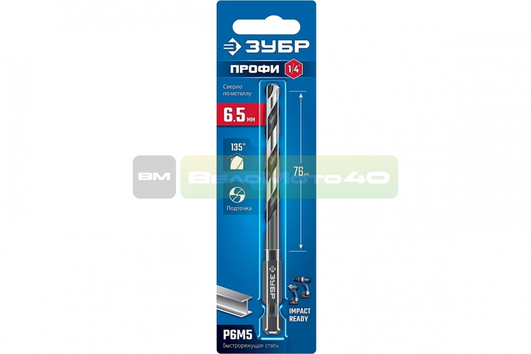 Сверло по металлу для винтовертов и шуруповертов ЗУБР Impact Ready НЕХ-1/4, 6.5x119 мм 29623-6.5